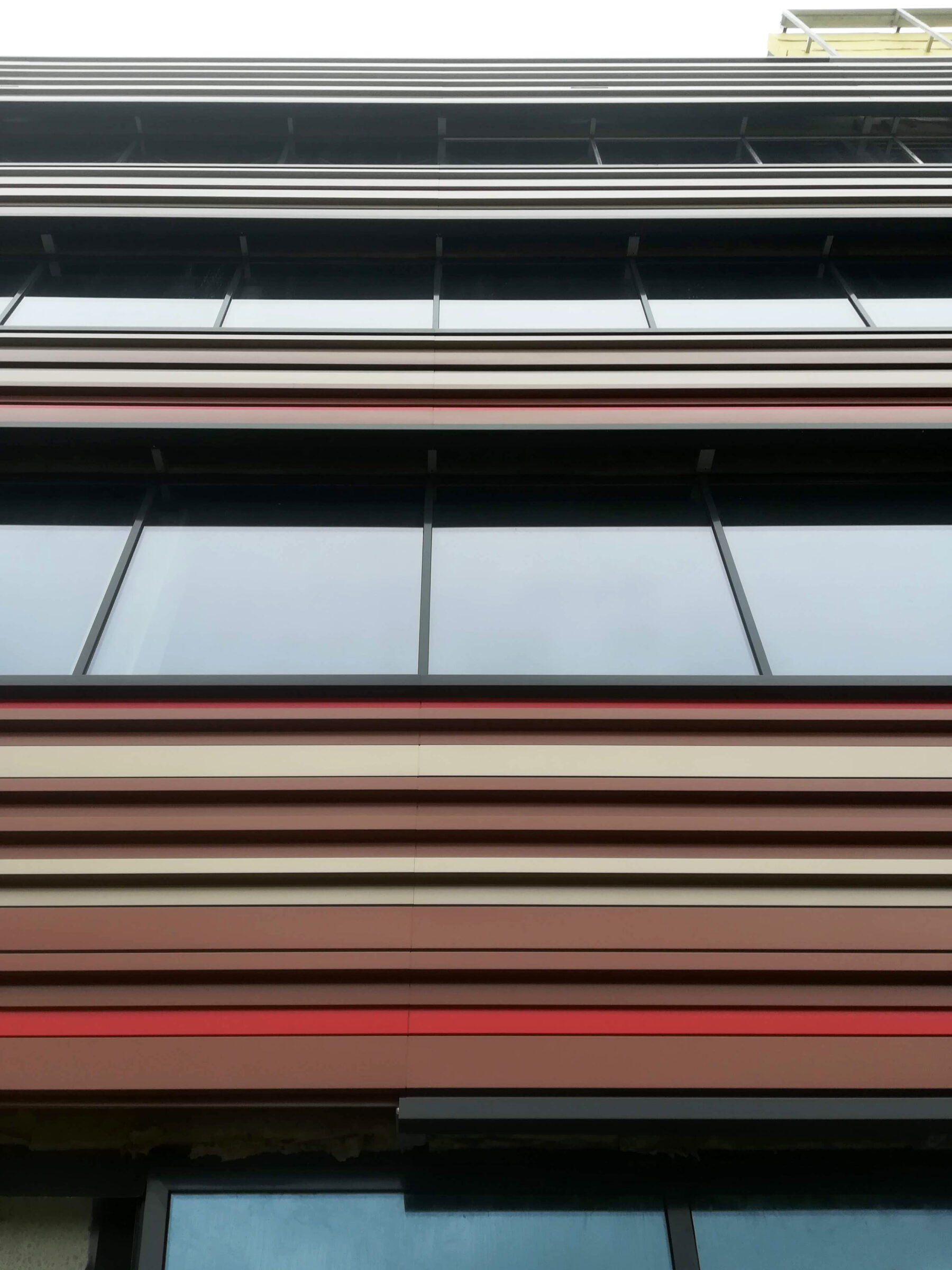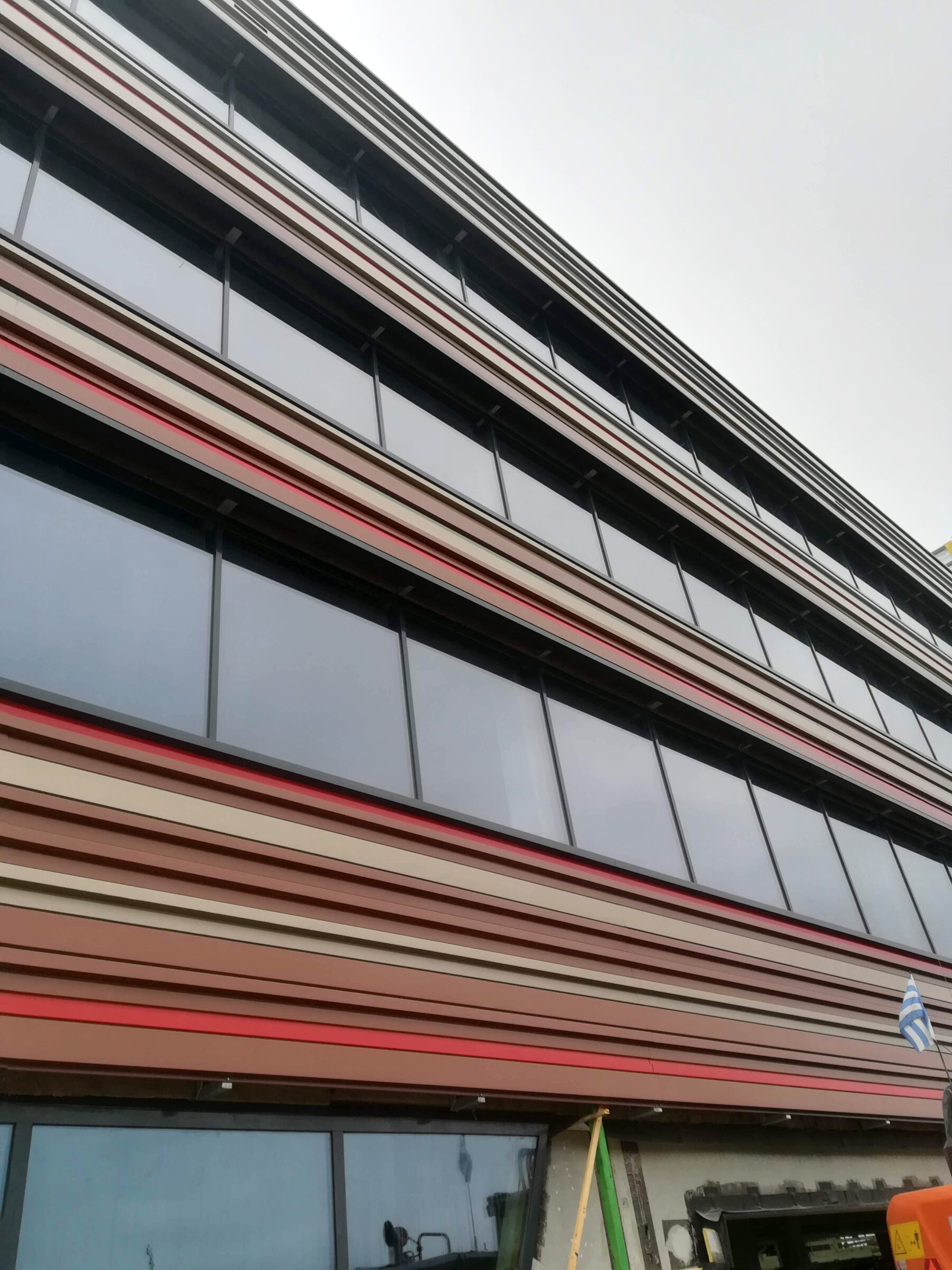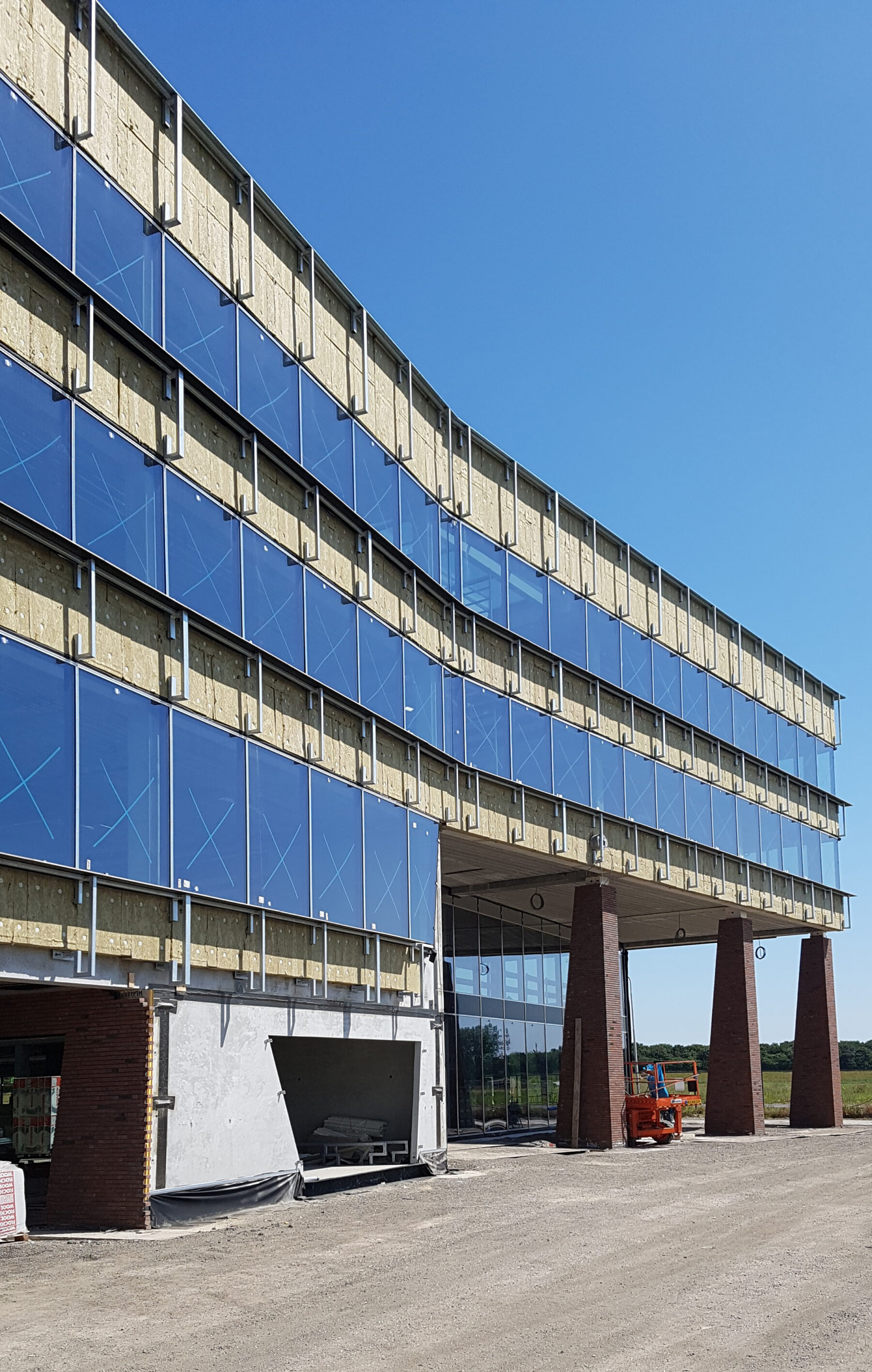 One façade – the east façade – is almost completely finished. The intended transition from brick to steel and the gradient of earth and green shades to the light gray-blue of the sky takes shape.